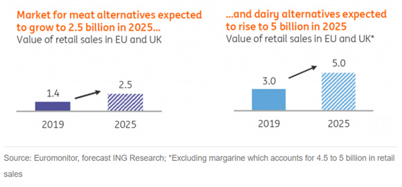 Analytici ING Bank odhadují, že hodnota trhu s náhražkami masa a mléčných výrobků v Evropské unii a Velké Británii dosáhne do roku 2025 hodnoty 7,5 miliardy dolarů v porovnání s 4,4 miliardami v roce 2019. Spotřebitele k tomu povede snaha o zdravější stravování, starost o „blahobyt“ zvířat a větší zájem o udržitelný ekonomický rozvoj. A kdo by mohl z takového trendu z veřejně obchodovaných firem těžit – napadá mě například americká společnost Beyond Meat, která je aktivní i v Evropě, či švýcarská potravinářská skupina Nestlé. Ta se na tuto část trhu zaměřuje stále více.