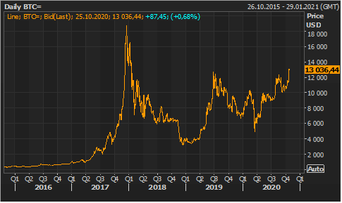 Bitcoin je letos opět středem zájmu investorů a spekulantů, i když zdaleka ještě nejde o takovou mánii jako v roce 2017, kdy jeho kurz během pouhých dvanácti měsíců strmě vylétl z jednoho tisíce dolarů až na 20 tisíc USD. Cena nejznámější a nejvyužívanější digitální měny v minulém týdnu překročila poprvé od července 2019 hranici 13 tisíc amerických dolarů. Od začátku roku je bitcoin v plusu o zhruba 80 procent. Od poloviny března pak dokonce o 165 procent. Na jaře i tuto kryptoměnu zasáhly výprodeje, podobně jako tomu bylo v případě akciových trhů.