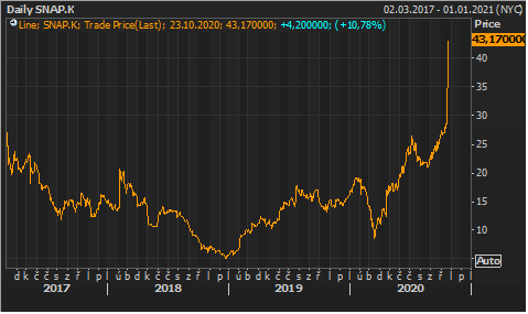 Na rekordní hodnoty vystoupala cena akcií společnosti Snap, která provozuje populární sociální síť Snapchat. Jen za minulý týden si její cenné papíry připsaly 55 procent. Zájem investorů vyvolalo zveřejnění výsledků hospodaření za třetí čtvrtletí. V něm sociální síti přibylo 11 milionů aktivních denních uživatelů, což předčilo očekávání analytiků. Lépe, než se čekalo, dopadly i tržby – ty se meziročně díky příjmům z inzerce zvýšily o 52 procent na 679 milionů dolarů. Hospodaření společnosti Snap je sice nadále ztrátové, ale už ne tolik jako v minulosti. V porovnání se začátkem roku je cena akcií vyšší o 164 procent. Na rekordu jsou mimochodem i akcie další sociální sítě Pinterest – od začátku roku jsou výše dokonce o 184 procent.